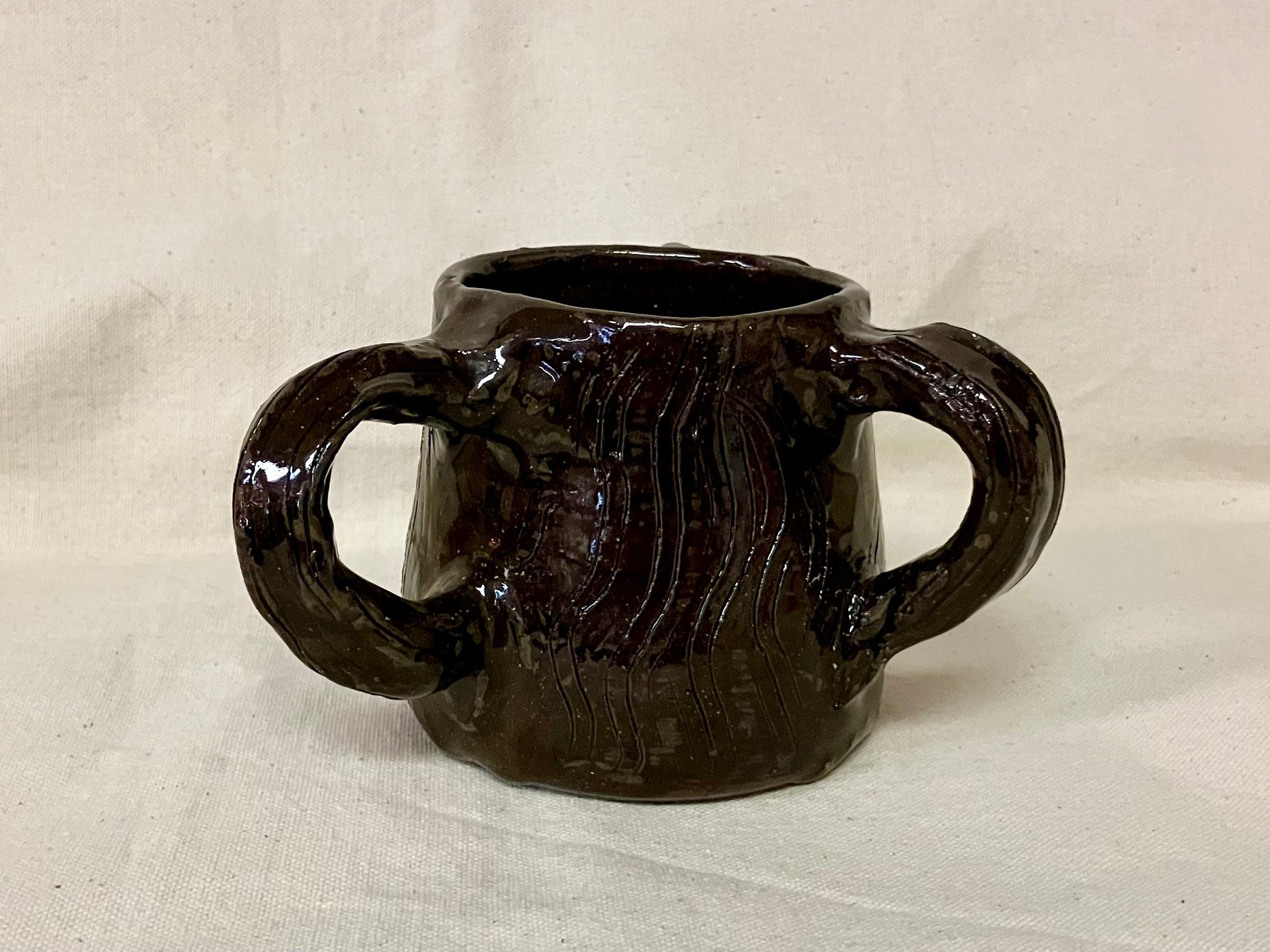 Made from black clay, this whimsical face emerges from a tree bark pattern in this fantastical two handles mug.