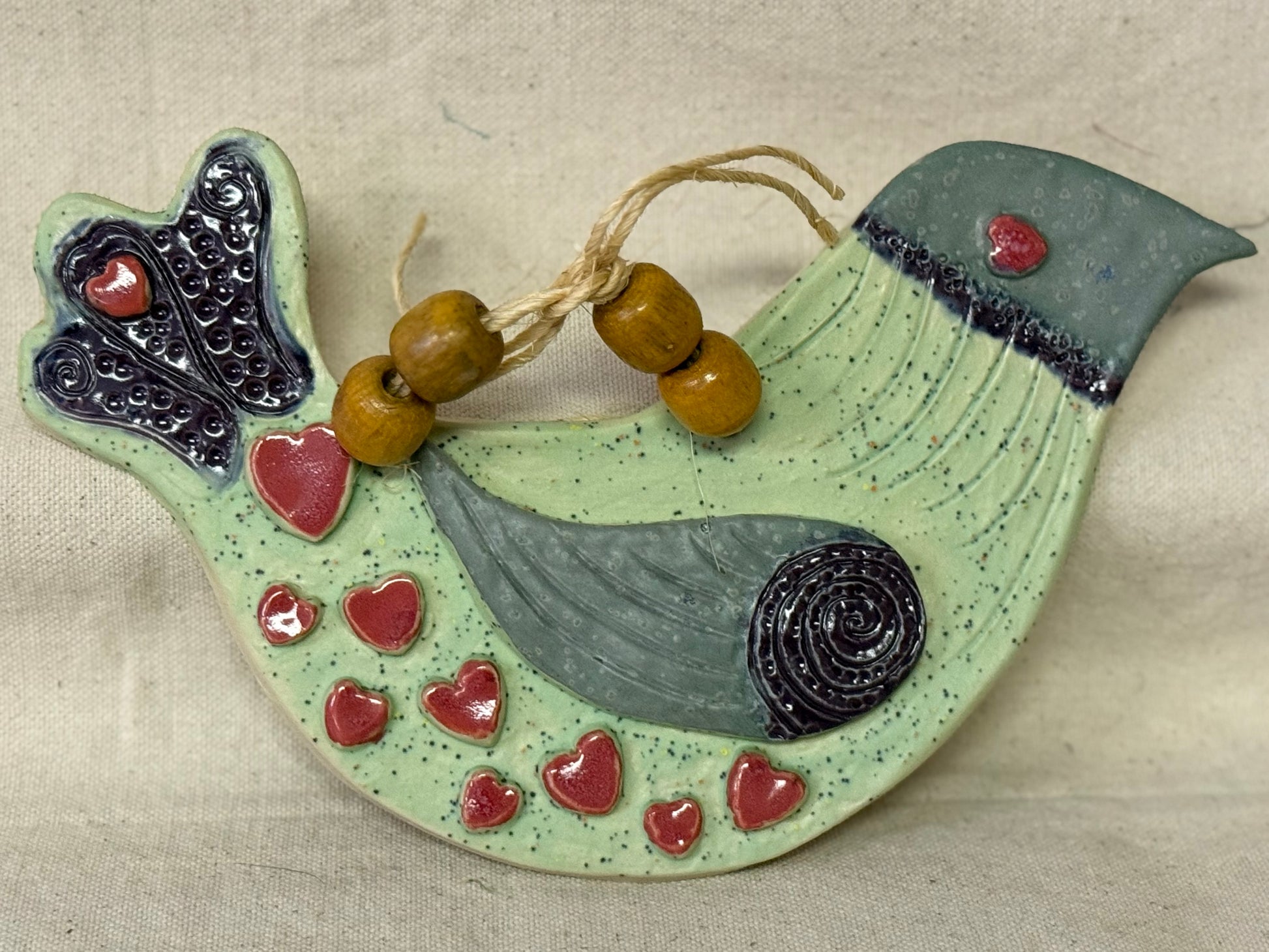 What a whimsical, sweet bird. This small wall hanging cutie is speckled mint and full of texture. It has beautiful blues that compliment its beauty and raspberry hearts.