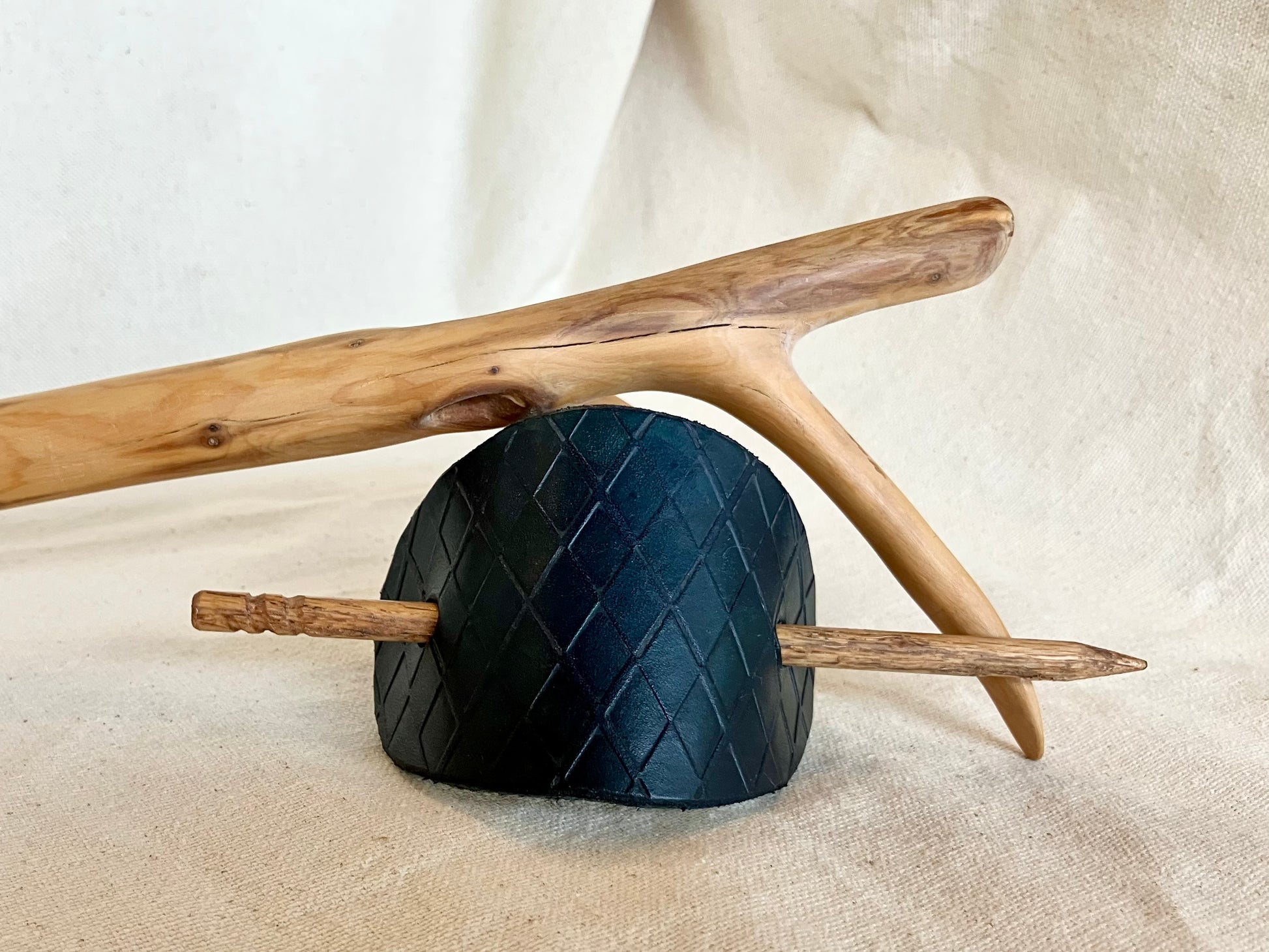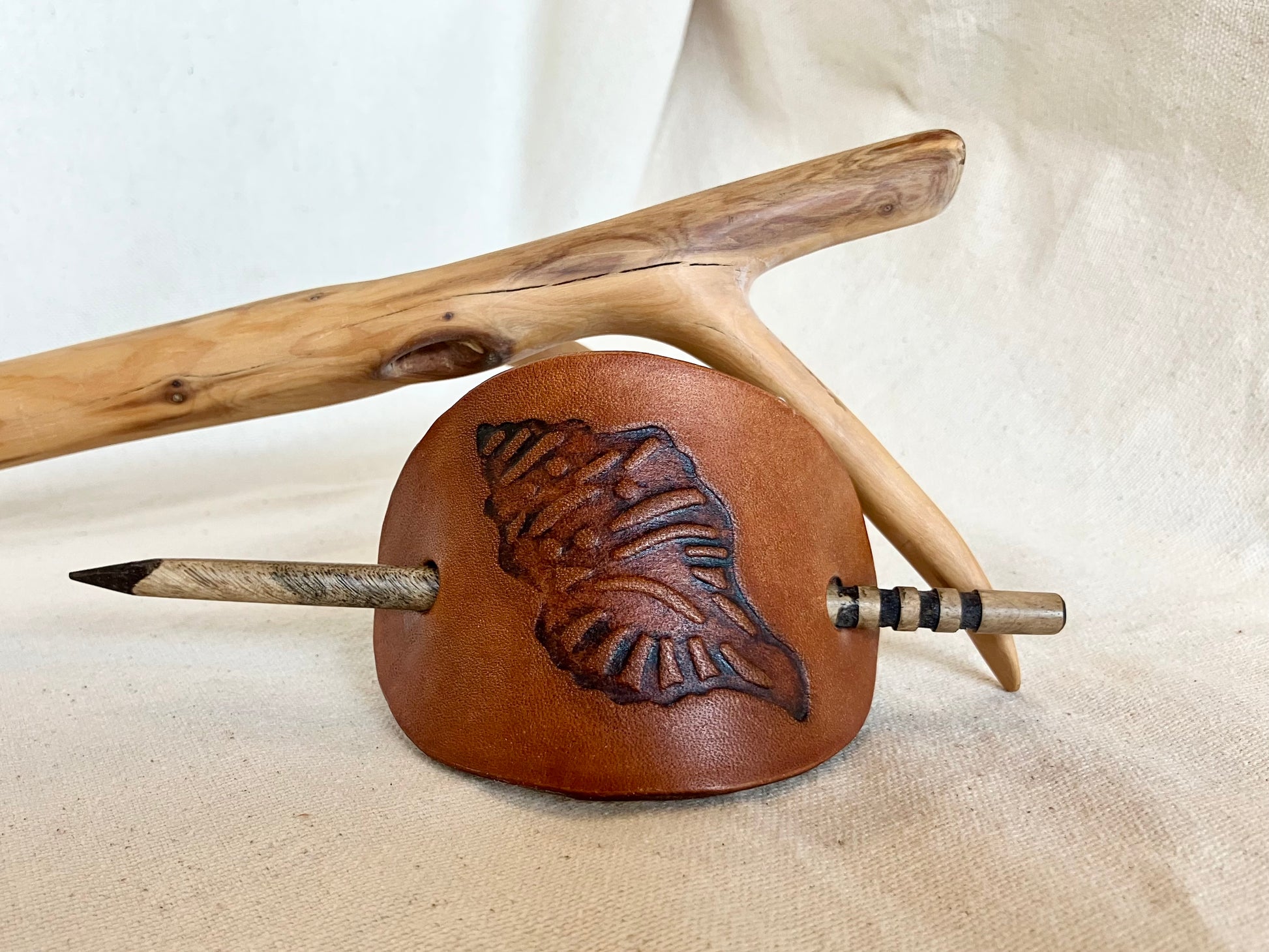 hair pin approx. 6” long and leather slide approx. 4.5” x 2.5”