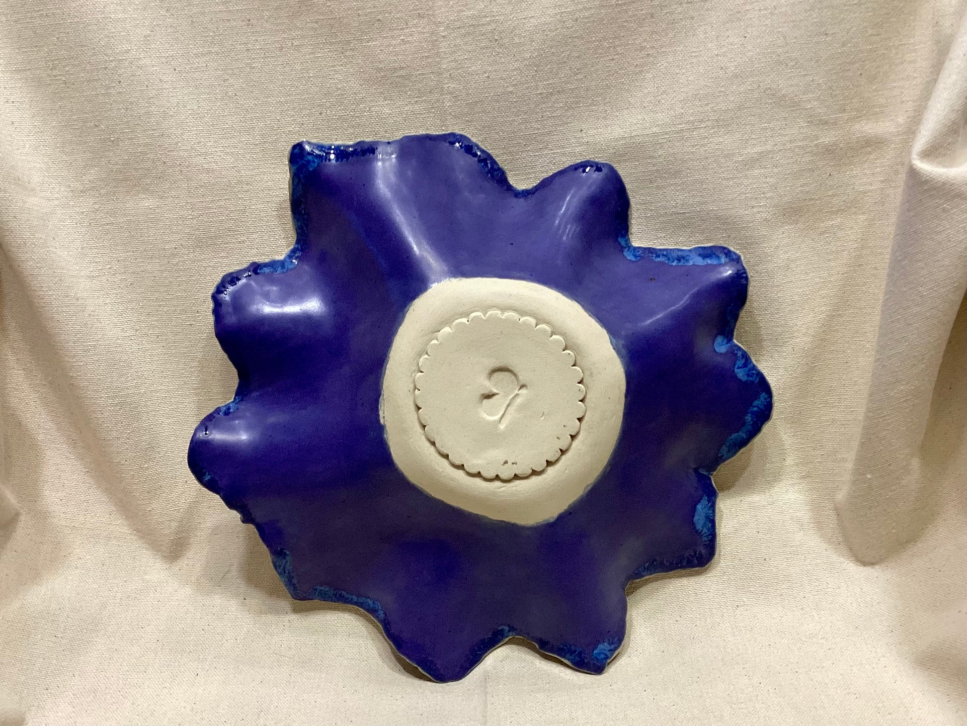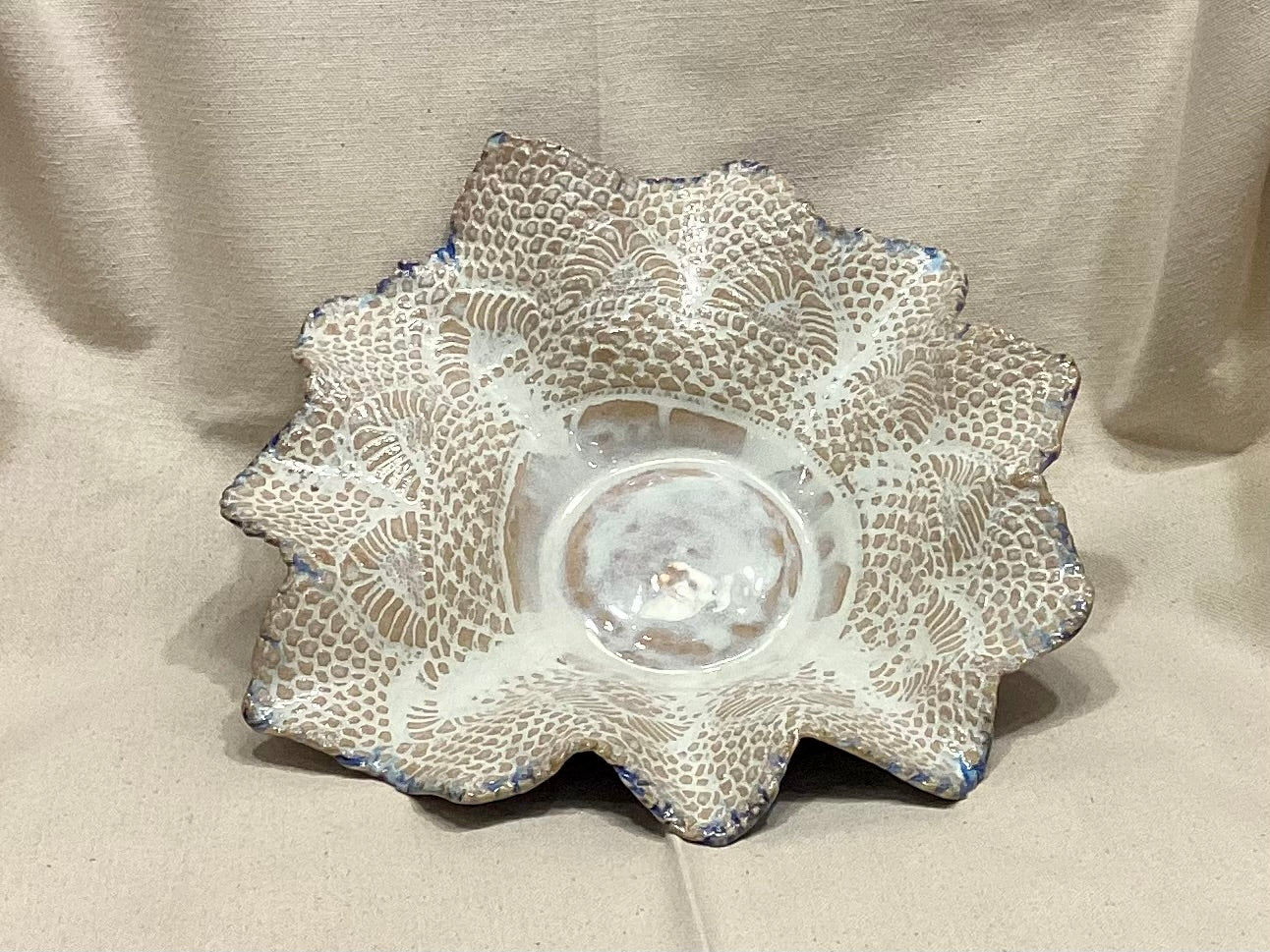 A slab built ceramic bowl with an intricate lace pattern pressed into the surface. The white and blue glazes pool into the crevices to reveal the gorgeous patterns.